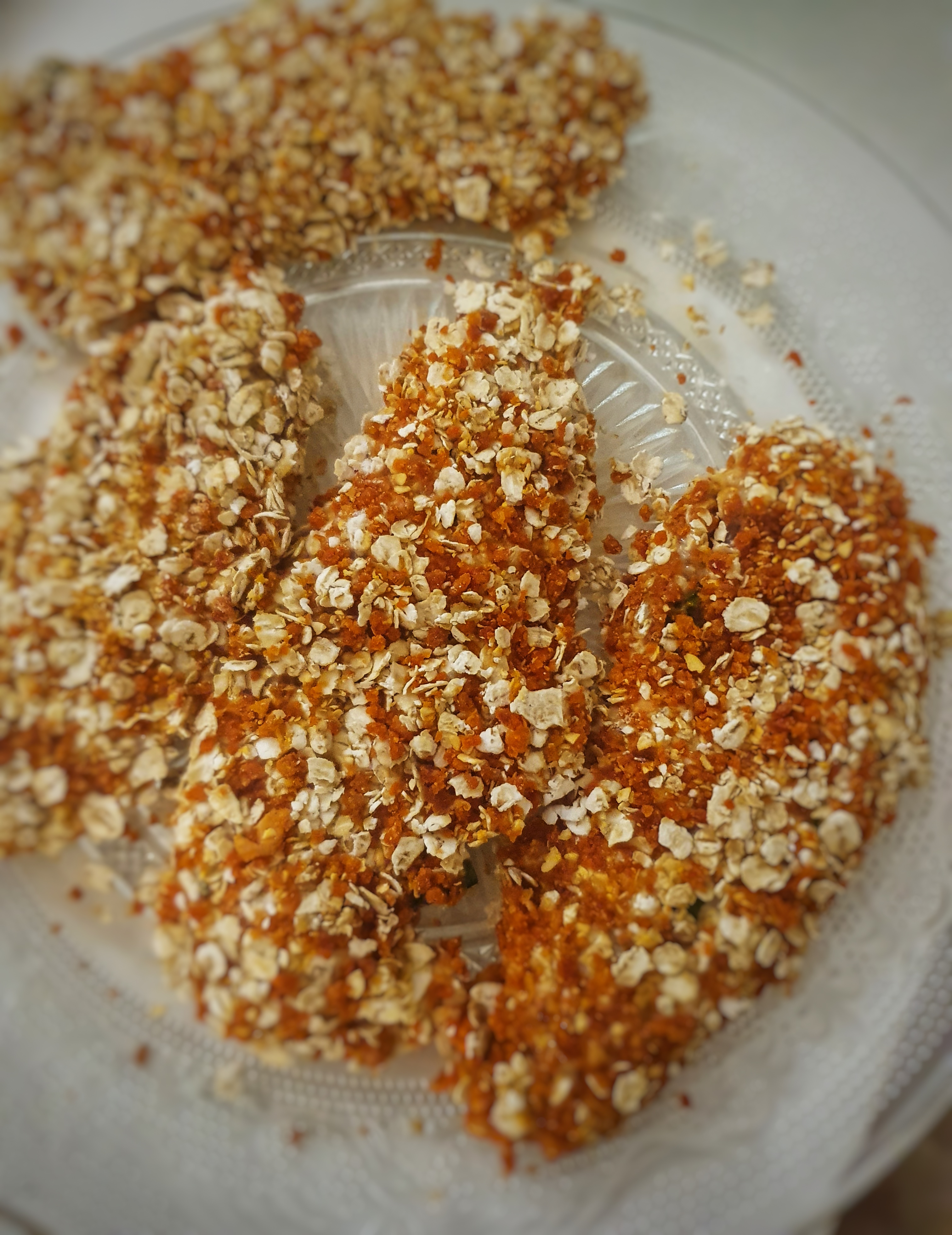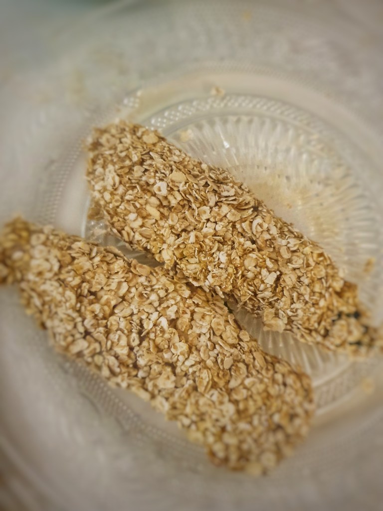 Passez vos filets dans la farine, puis dans l’œuf et ensuite dans les flocons d’avoine. Répétez l’opération pour chaque aiguillettes .