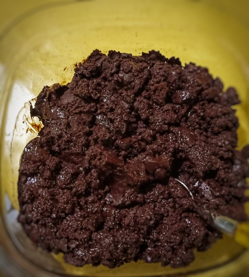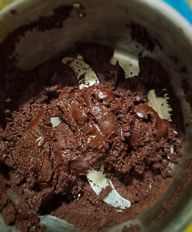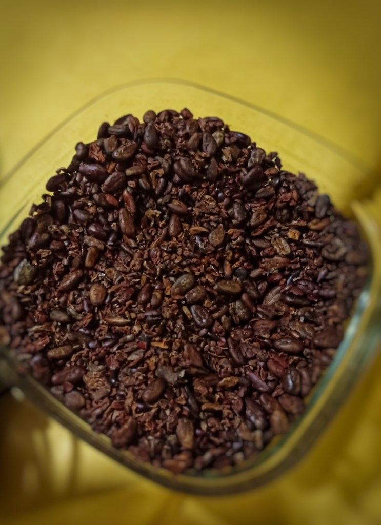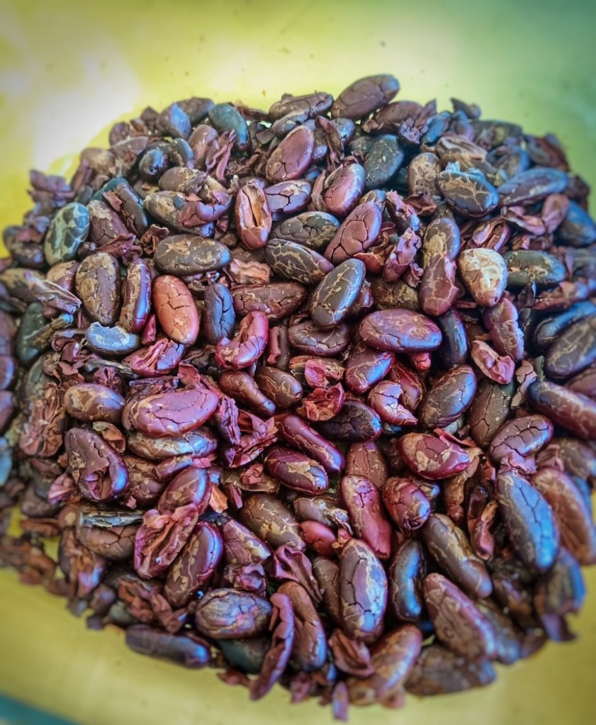 L’enveloppe qui entoure les fèves doit commencer à s’enlever. Hors du feu, on enlève le reste de la pellicule qui recouvre les fèves puis on les place dans une broyeuse. On obtient ce qu’on appelle la » masse de cacao ».